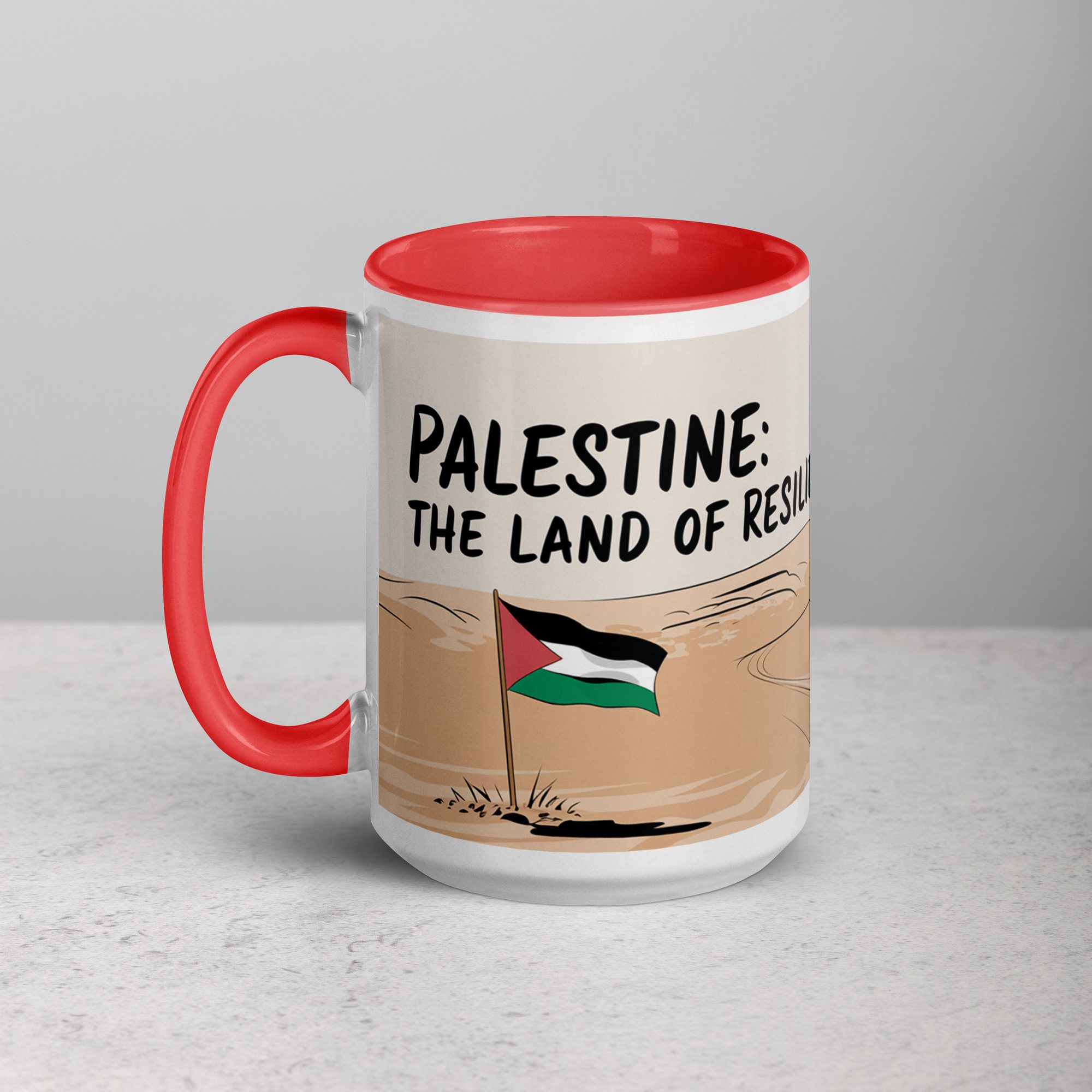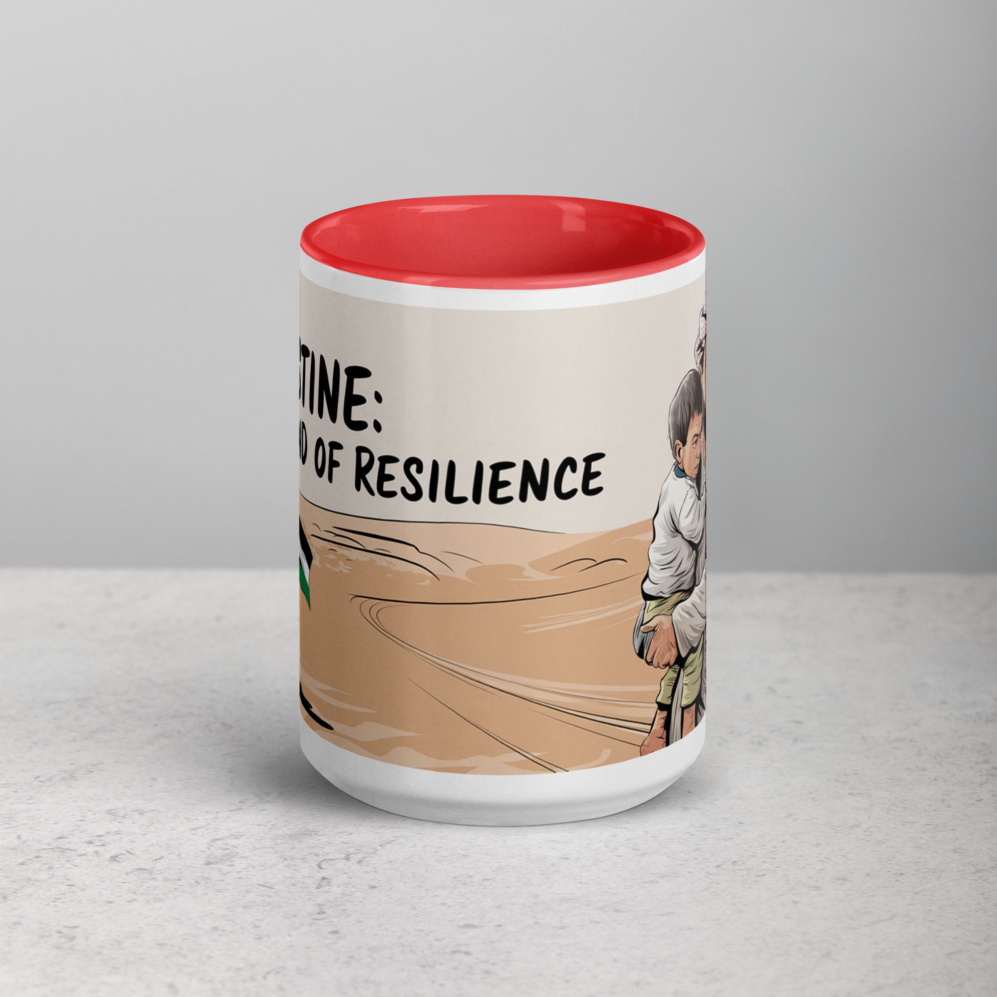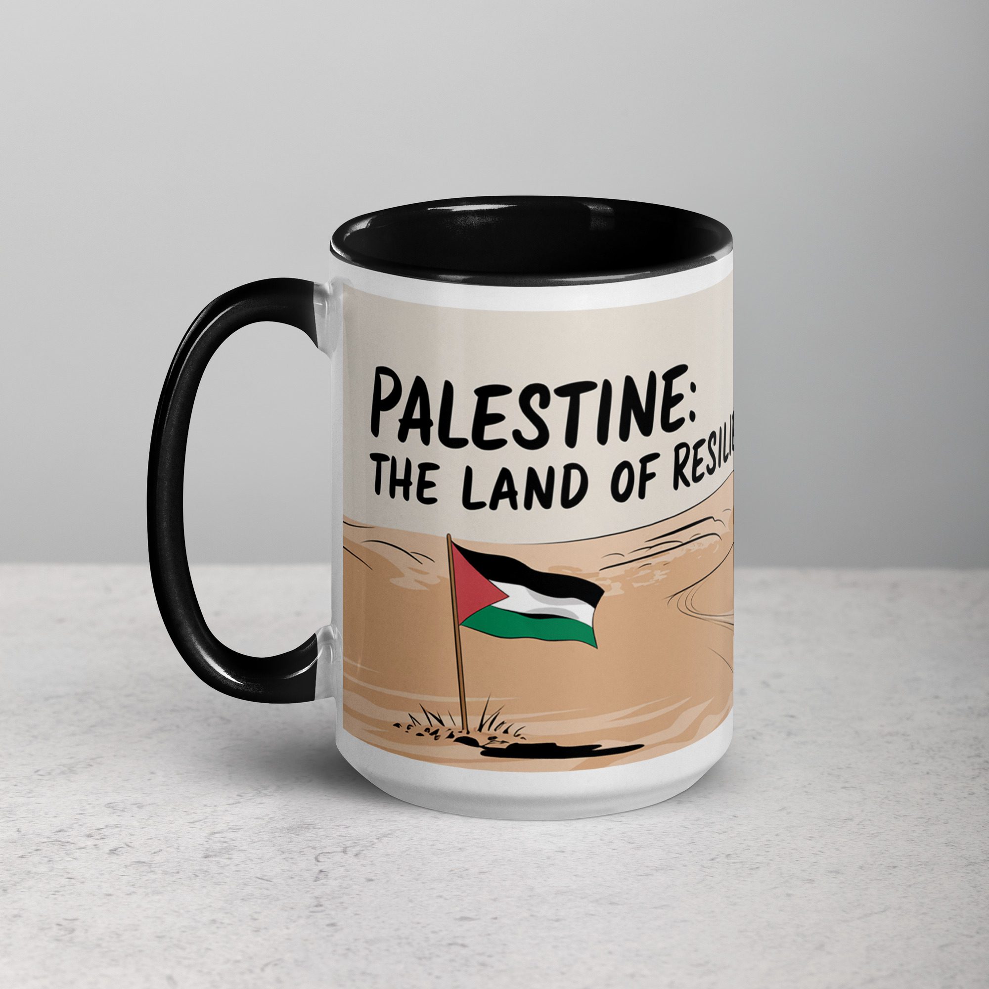 A tribute to resilience, love, and homeland. This beautifully designed ceramic mug features a striking image of a vast desert landscape, with a Palestinian flag firmly planted in the sand—symbolizing unwavering strength and deep-rooted identity. In the foreground, a Palestinian father holds his child in his arms, embodying the enduring hope and determination of generations fighting for freedom. Accompanied by the powerful phrase “Palestine: The Land of Resilience,” this mug serves as a reminder that no hardship can break the spirit of a people devoted to their land, their families, and their future. Whether you’re starting your morning with coffee ☕ or winding down with tea 🍵, this mug is more than just drinkware—it’s a message of perseverance and love.