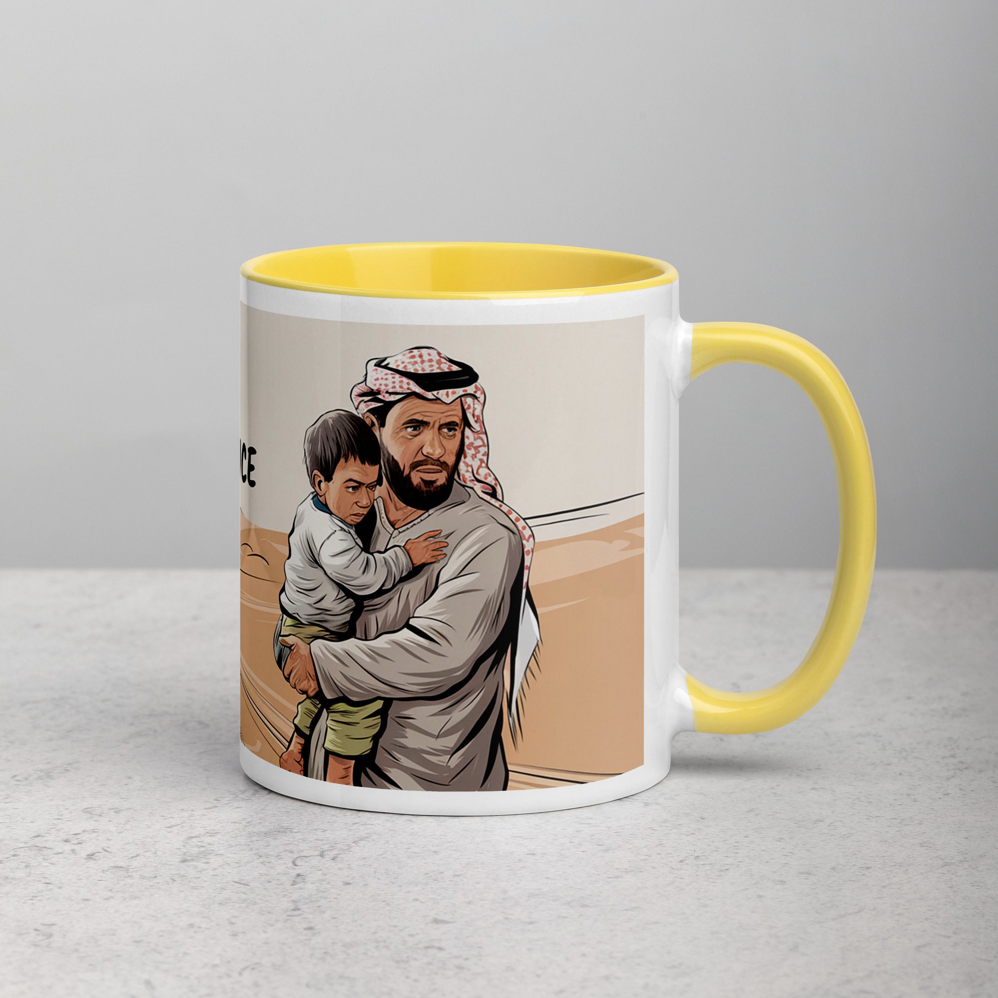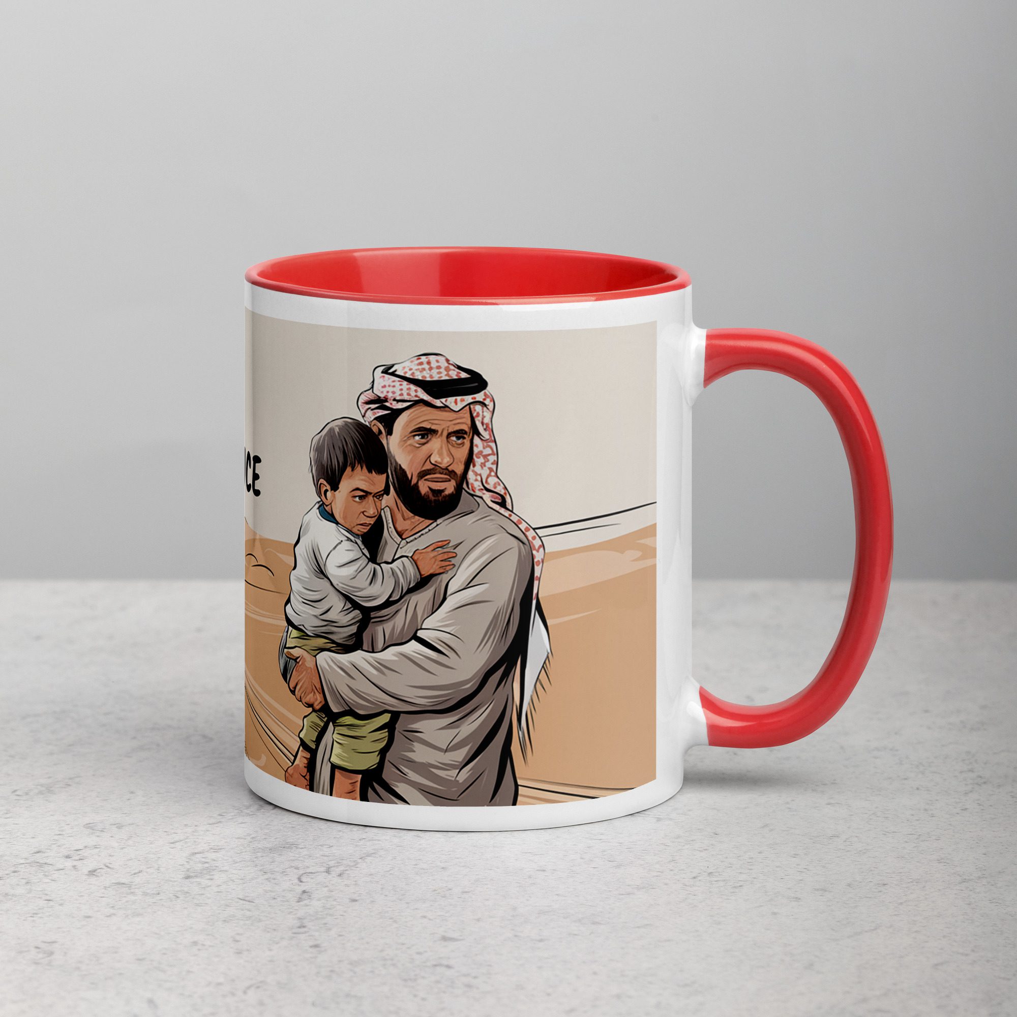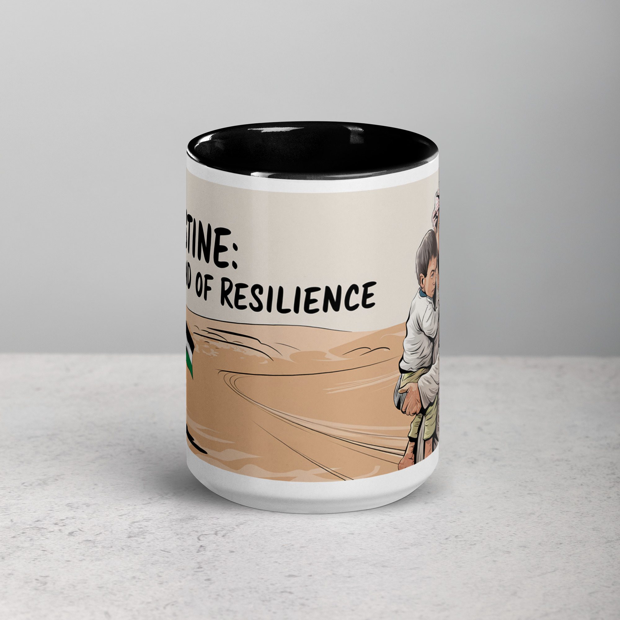 A tribute to resilience, love, and homeland. This beautifully designed ceramic mug features a striking image of a vast desert landscape, with a Palestinian flag firmly planted in the sand—symbolizing unwavering strength and deep-rooted identity. In the foreground, a Palestinian father holds his child in his arms, embodying the enduring hope and determination of generations fighting for freedom. Accompanied by the powerful phrase “Palestine: The Land of Resilience,” this mug serves as a reminder that no hardship can break the spirit of a people devoted to their land, their families, and their future. Whether you’re starting your morning with coffee ☕ or winding down with tea 🍵, this mug is more than just drinkware—it’s a message of perseverance and love.
